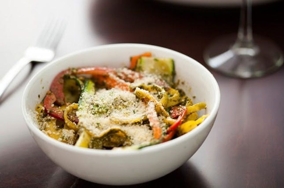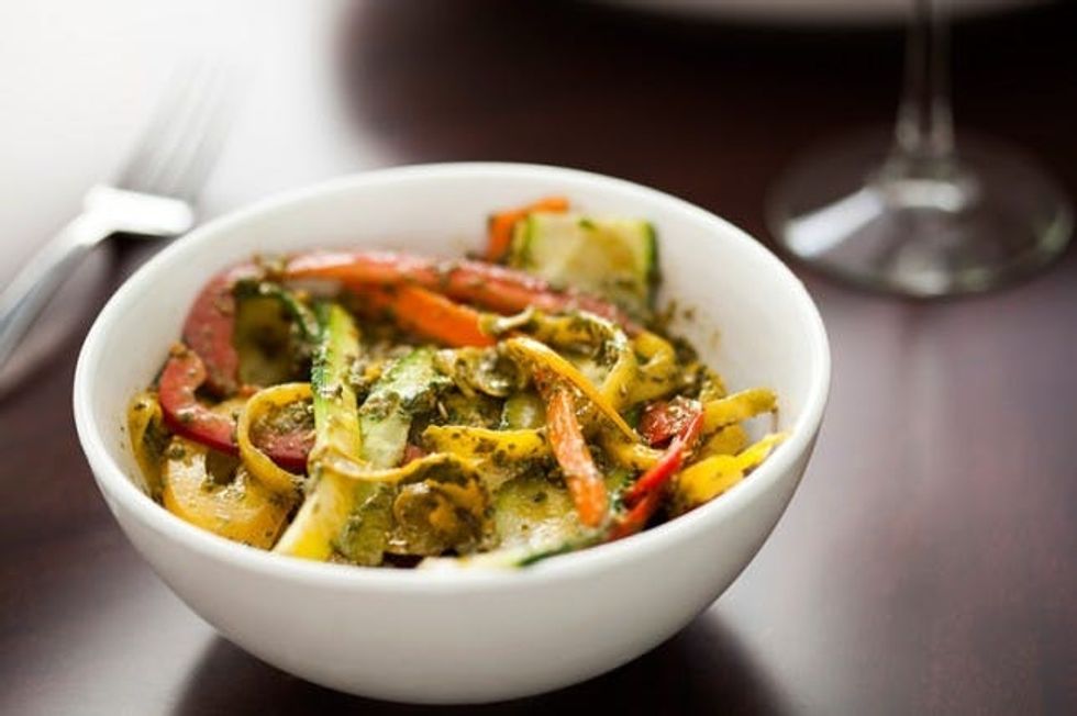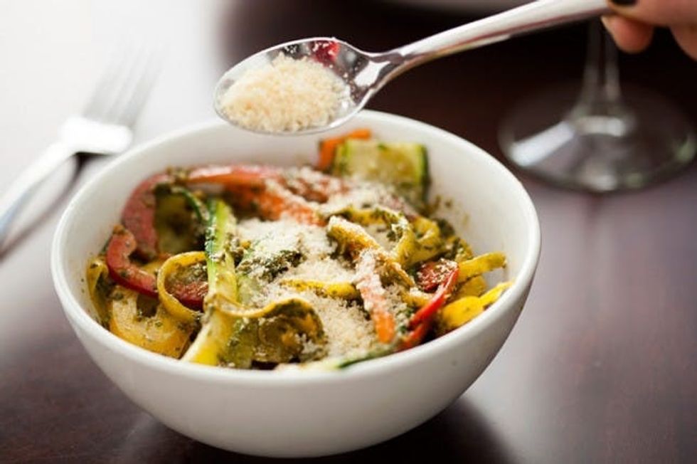 Toss the fresh veggies with the pesto. Top with Parmesan cheese.