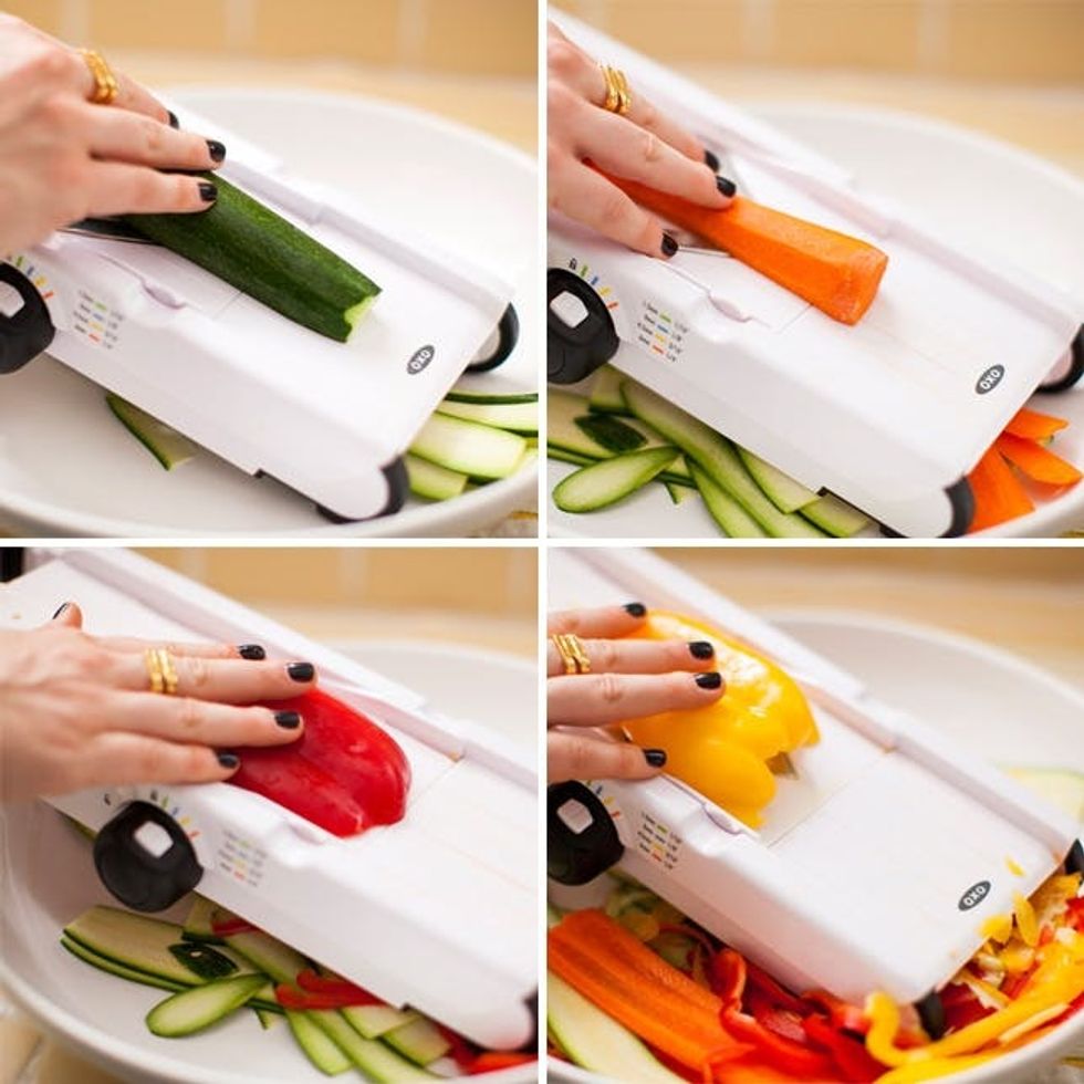 Slice the veggies (very carefully!) using a mandolin. Set aside.