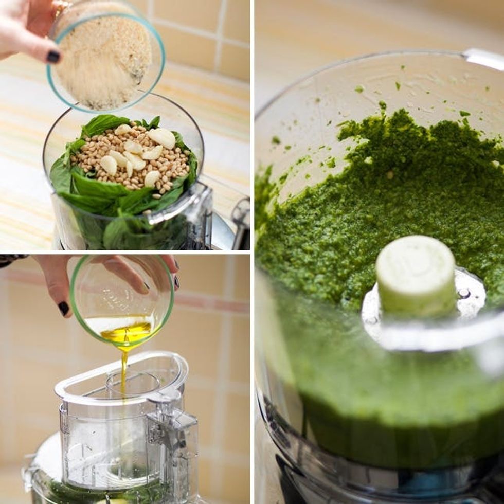 1. Place the basil leaves, Parmesan, pine nuts, garlic, salt, and pepper in the food processor. Pulse until combined. Slowly stream in the olive oil and continue to pulse. Scrape down the bowl, as needed.