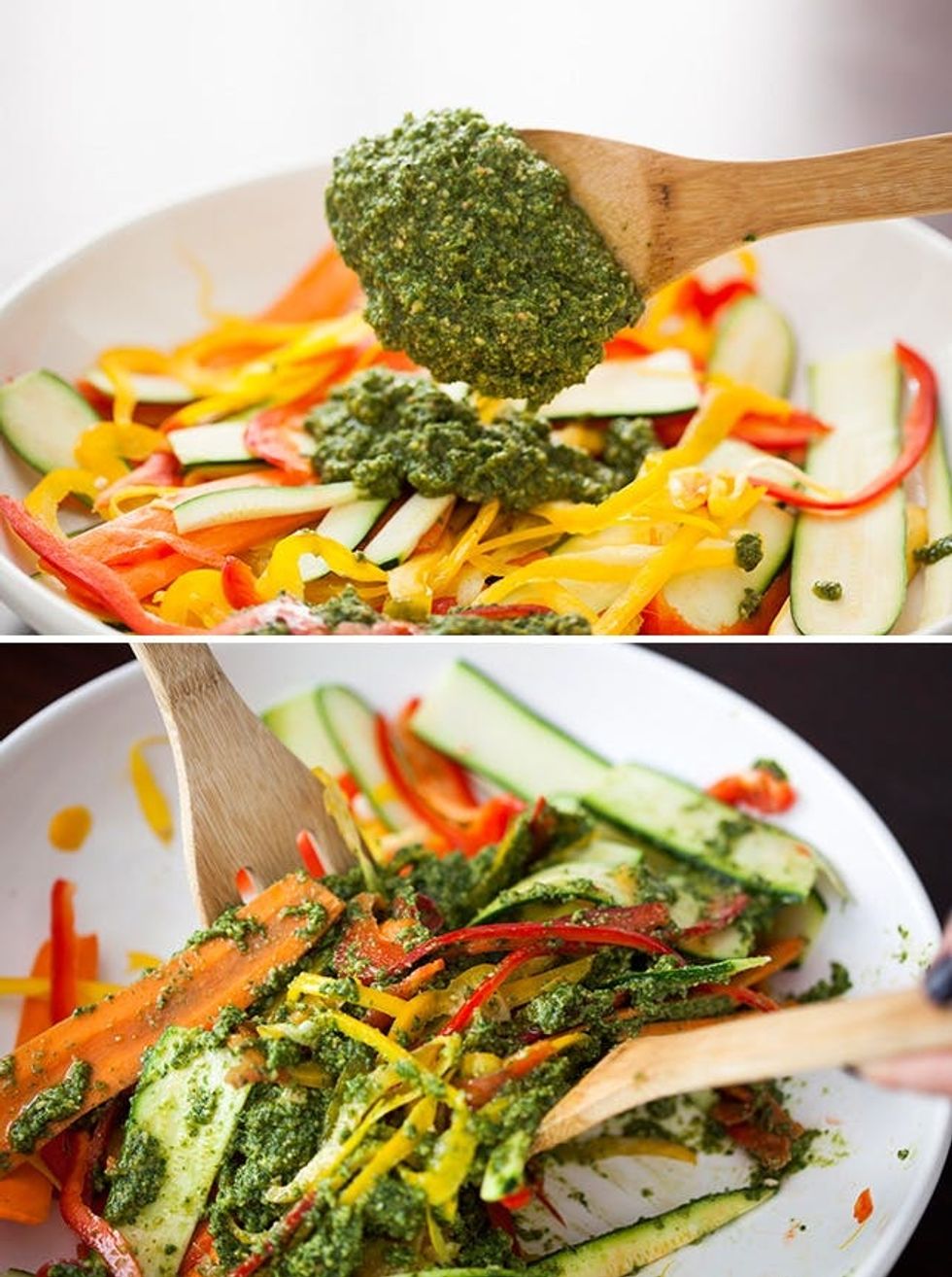 If you haven’t noticed, it’s summer produce week here at Brit HQ. We’ve given you 2o yummy zucchini recipes, healthy Chocolate Chip Walnut Zucchini Muffins, and now we’re serving up some No-Cook Veggie Pasta. Not only is this a delicious way to use up all those fresh summer veggies, but these colorful noodles are gluten free and simple as can be. Plus, you can whip them up in under 15 minutes! So what are you waiting for?