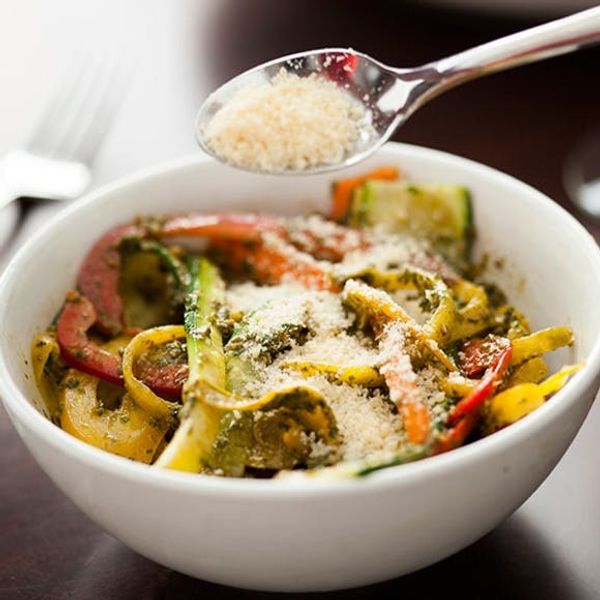 Toss the fresh veggies with the pesto. Top with Parmesan cheese.
