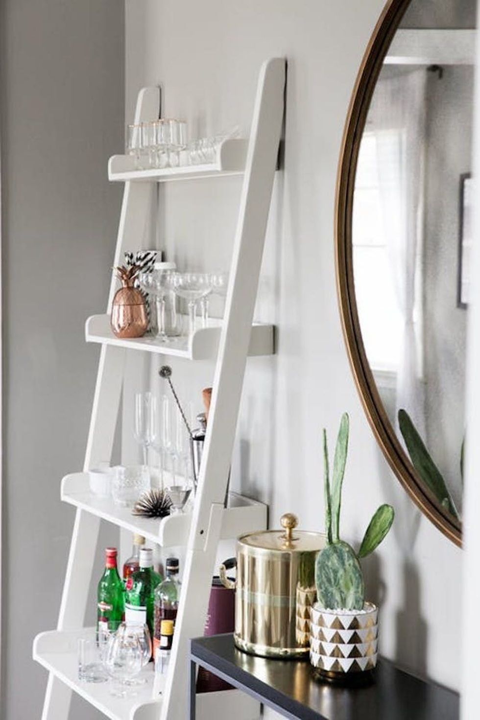 Instead of using a traditional cart, create a cocktail-making space that goes UP. It not only looks super cool, it’s extremely apartment-friendly and space-saving. You can get pretty creative. Shelves make for fantastic vertical bar material, as do vintage ladders painted in the color of your choosing.