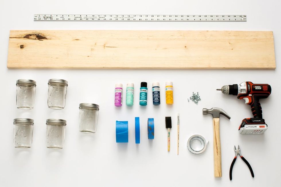 Now this is where it gets tricky! The galvanized metal tape is malleable but sharp, beware! Wrap it around the circumference of the mason jar, leave room for 2-inch tabs on either side. Ours measured about 12 inches. Place your first jar 4-5 inches from the top of the board. Place the galvanized metal tape around the middle of the jar and mark where you will be drilling. Repeat this process for all five jars.