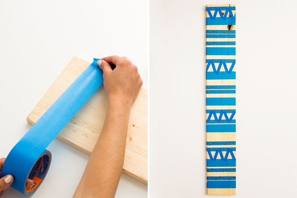 1. Using three different widths of painters tape, create a pattern on your wood.