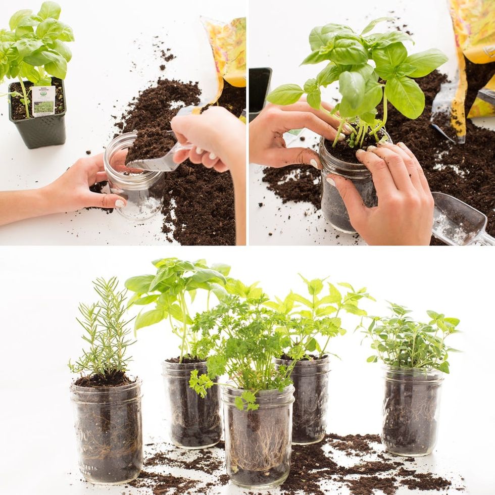 7. Time to plant! We planted basil, oregano, mint, parsley, and rosemary. Add some extra planting soil in your mason jars with the fresh herbs.