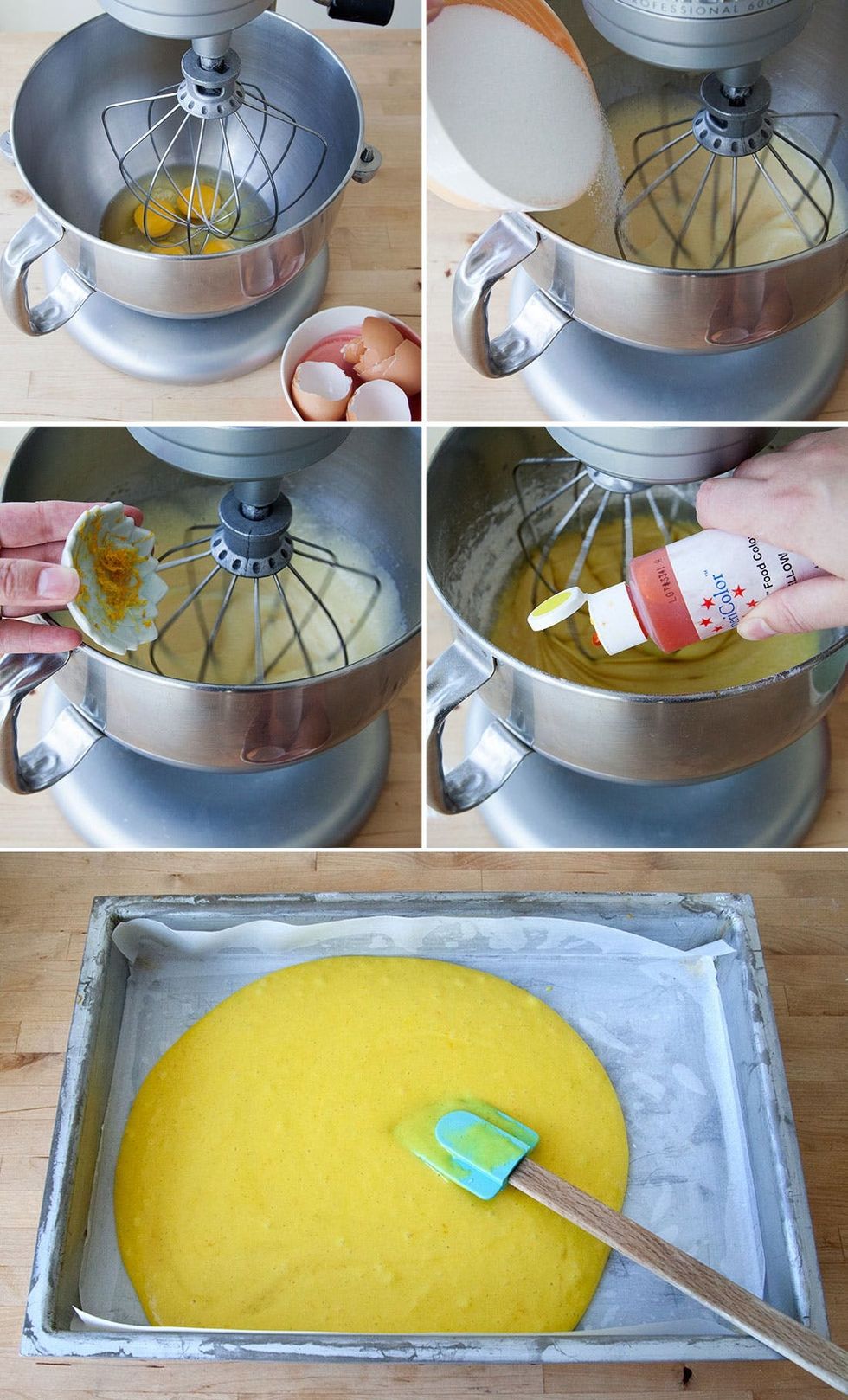 While your oven is preheating to 350 degrees F, beat eggs until they turn a pale yellow, then gradually add in the sugar, vanilla, lemon juice and zest. Add in the sifted dry ingredients along with the yellow food coloring to give the cake a pop of color. Then spread the batter onto a parchment paper-lined sheet pan — oooh, so pretty already! You’ll pop this — and a second identical batter-filled pan — into the oven for about 12-14 minutes. When it’s done baking, place the warm cake on a powder sugar-dusted kitchen towel and get ready to roll!