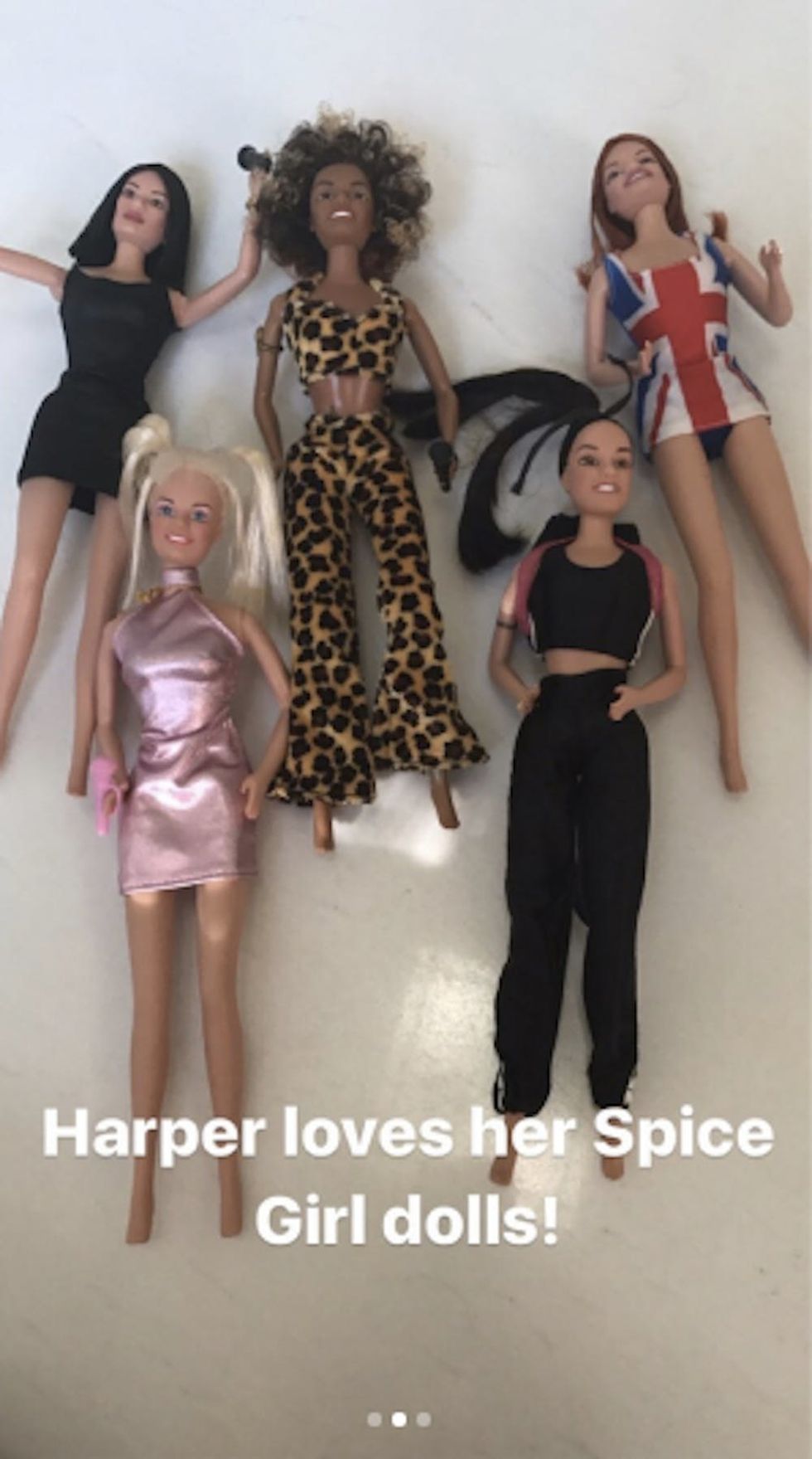 It was clearly a proud moment for the 43-year-old designer, who captioned the shots with lines from her own songs (“Spice up your life!”) and an exclamatory statement of “Harper loves her Spice Girls dolls!”