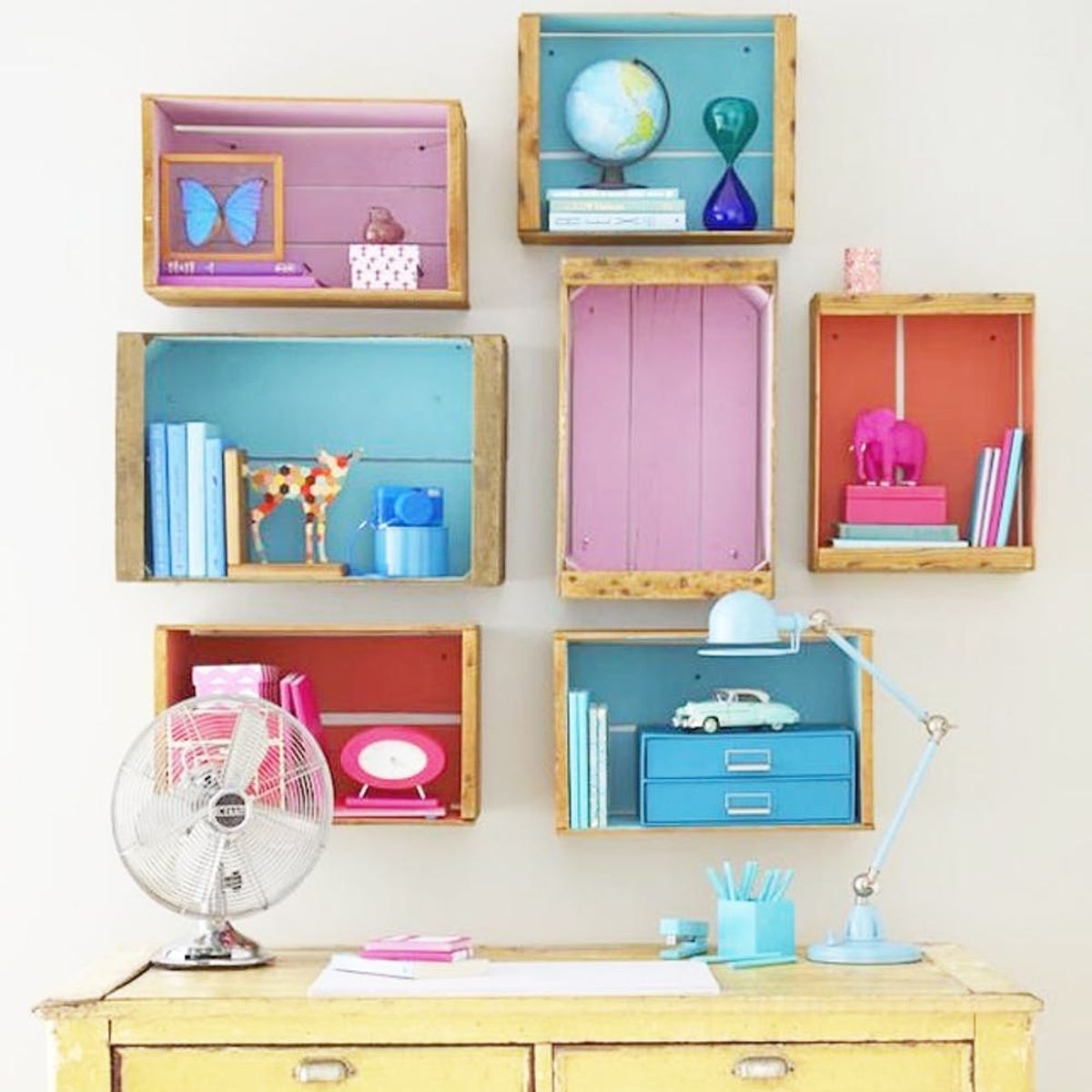 5. Wooden Crates: Instead of regular shelves, opt for wooden crates and paint the insides to add pops of color. They’re basically begging to be filled with fun pens and notebooks. (via HGTV)