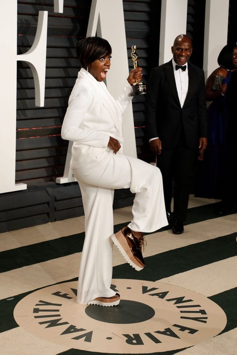So we weren’t too surprised that she didn’t put her heels back on for the Vanity Fair after-party. Instead, Davis opted to wear a pair of Stella McCartney Creepers ($950) with her Brandon Maxwell lapel jacket and wide-leg pants. Casual AND cool.