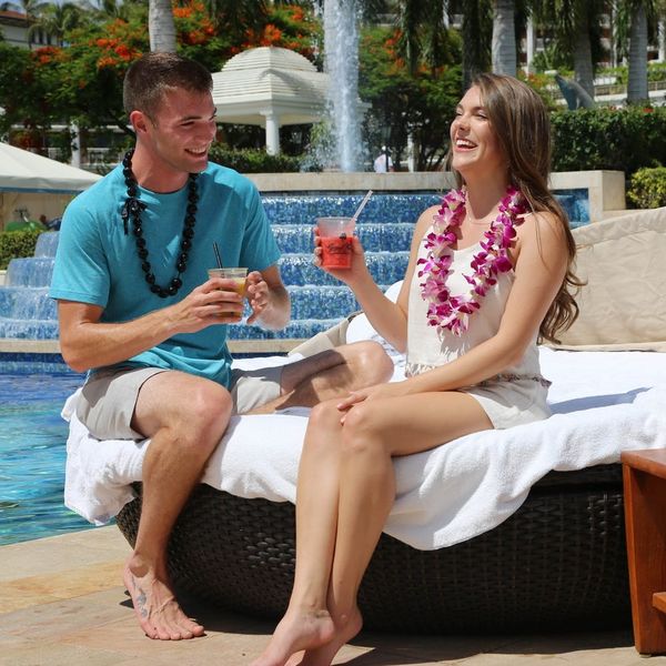 Their Maui weekend started with Avsec and Arendas getting lei’d at the Grand Wailea. They headed to the Lucky Mermaid fountain to cast a wish, then went on an adorable bike ride before retiring poolside for some colorful cocktails.