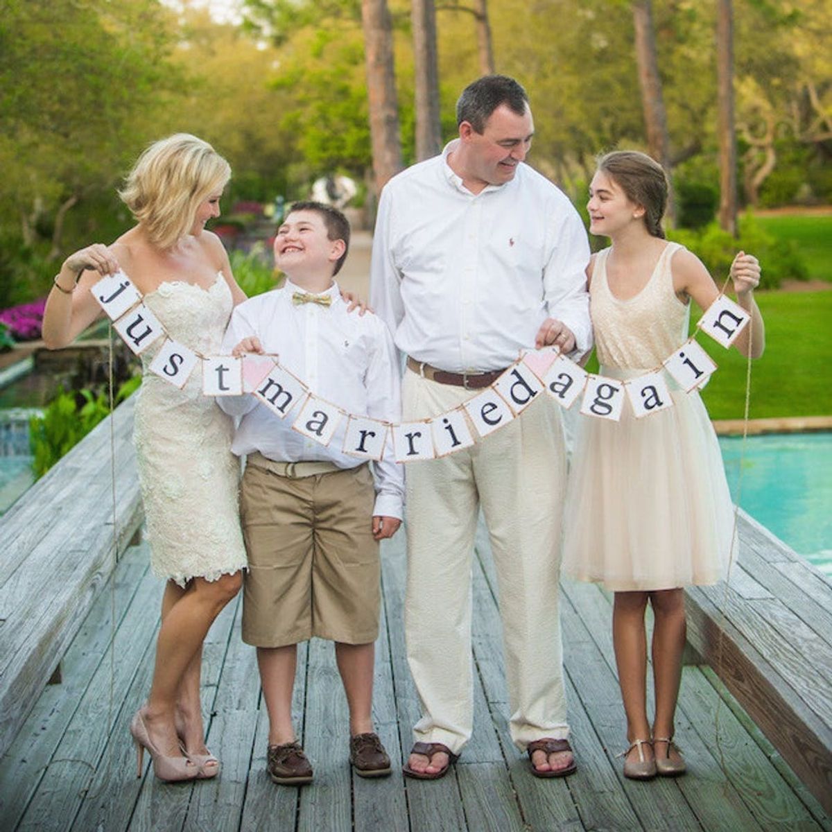 4. Signed, Sealed, Delivered: Update a lovely dovey wedding-day photo with a kissing shot behind beautifully scripted “renewed” sign. (via Corbin Gurkin)