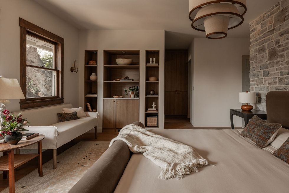 Here's more stone in the master bedroom paired with neutral linens, furniture and rug. Built-in bookshelves are functional and aesthetic, a perfect spot for more stoneware.