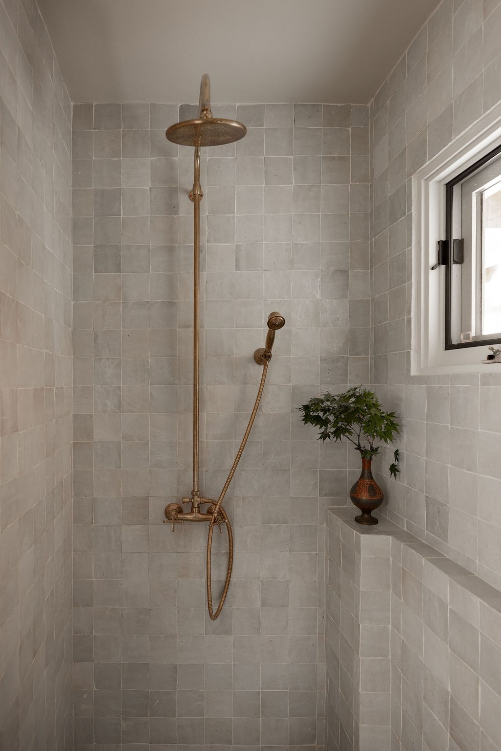 The perfectly imperfect look of this Zia Zellige Racing Green tile complements the natural, rustic yet refined elegance of the home.
