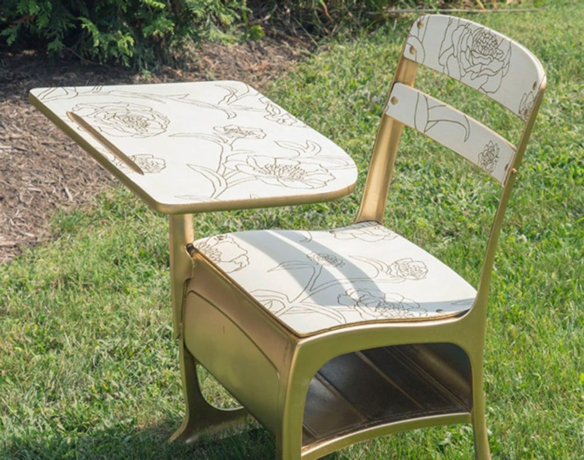 As this month winds down, we’re wrapping up our last few office themed DIY projects. And we’ve saved one of our favorites for last! This DIY comes from our friends at ModCloth. They took a vintage elementary school desk and turned it into a fabulous white and gold piece.