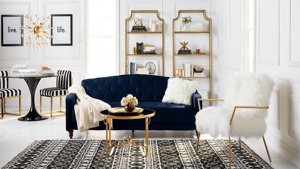 Glam Living Room: A luxurious looking velvet coach and some furry Better Homes and Gardens decorative toss pillows ($12) will go far in making your central living space feel uber-glam.