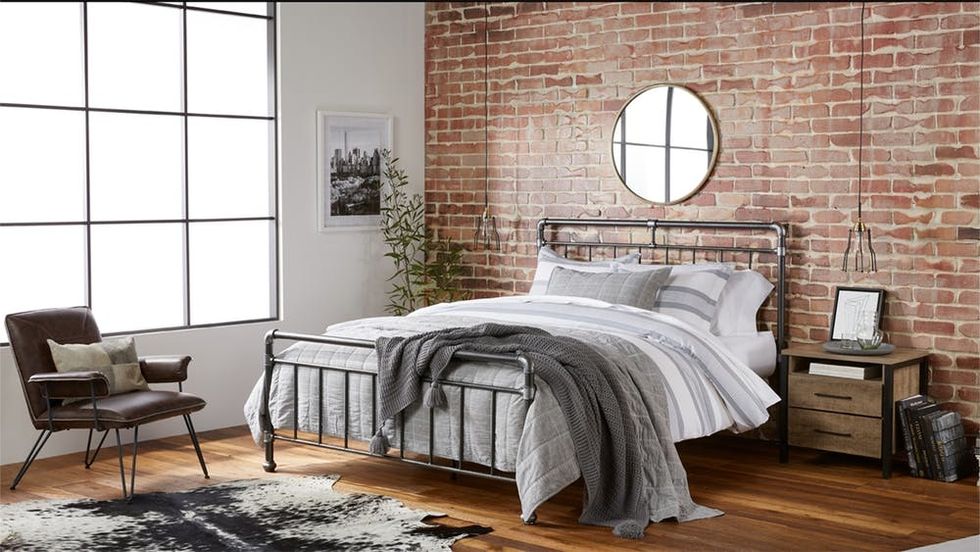 Industrial Bedroom: Using stark clean lines and muted gray hues, you can easily snag the look of this industrial room: This Trademark Art NYC canvas art ($42 to $79) is similar to the one shown on the wall, and a Mainstays metal and wood nightstand ($69) stands in for the one that's here.