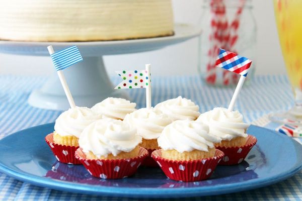 Grap your straws and lollipop sticks. Wrap washi tape around the tops of straws, leaving some room at the top to sip. Trim ends into pennants, if desired. Repeat process with lollipop sticks. Trim down the ends of the sticks if you want to use them as cupcake toppers.
