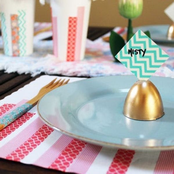 First, take the top half of a plastic egg and use an Xacto knife to cut a slit at the top. The plastic may crack a little bit, but that’s okay. Spray paint the eggs gold and let dry. While they dry, create adorable name cards with card stock and washi tape. Simply cover the paper with washi, snip off excess tape, and write names in Sharpie.
