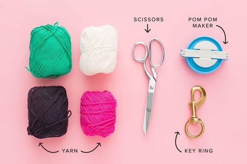 5. Tie the untrimmed pieces of yarn around the key ring. Make a bunch of watermelon poms or let one hang solo.