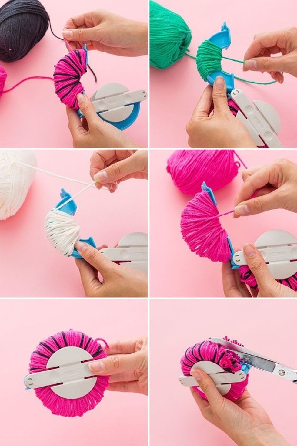 1. Wrap half of the pom pom maker with pink yarn and a few bits of black yarn.