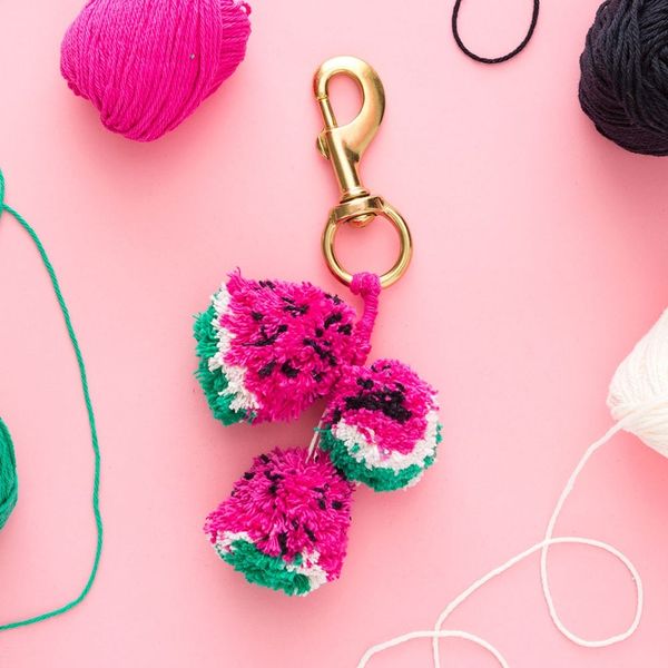 Let's be real: Watermelons make everything better. Need ice cubes? Make them with watermelon! Champagne cocktails? Add watermelon! Margaritas, cake, doormats, fanny packs? Watermelon, watermelon, watermelon, watermelon. Let's just throw a watermelon party already! Basically, we're saying: Don't stop until your diet, furniture and closet involve some melon. One way to add some watermelon love to your bags and accessories is this DIY watermelon pom pom keychain. We were inspired by this tutorial to make ours. Get ready for some cuteness overload.