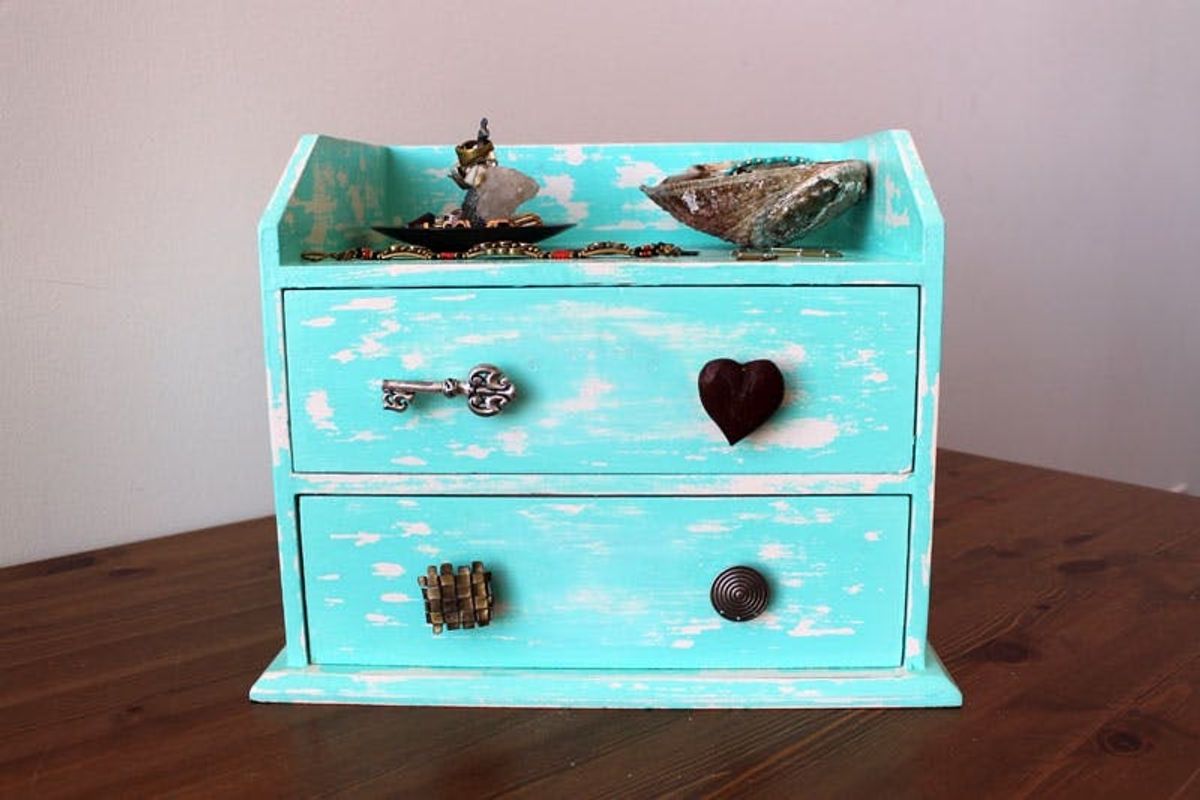 Screw in four screws to the jewelry box. Then use glue to attach your jewelry pieces to the screws to create knobs.
