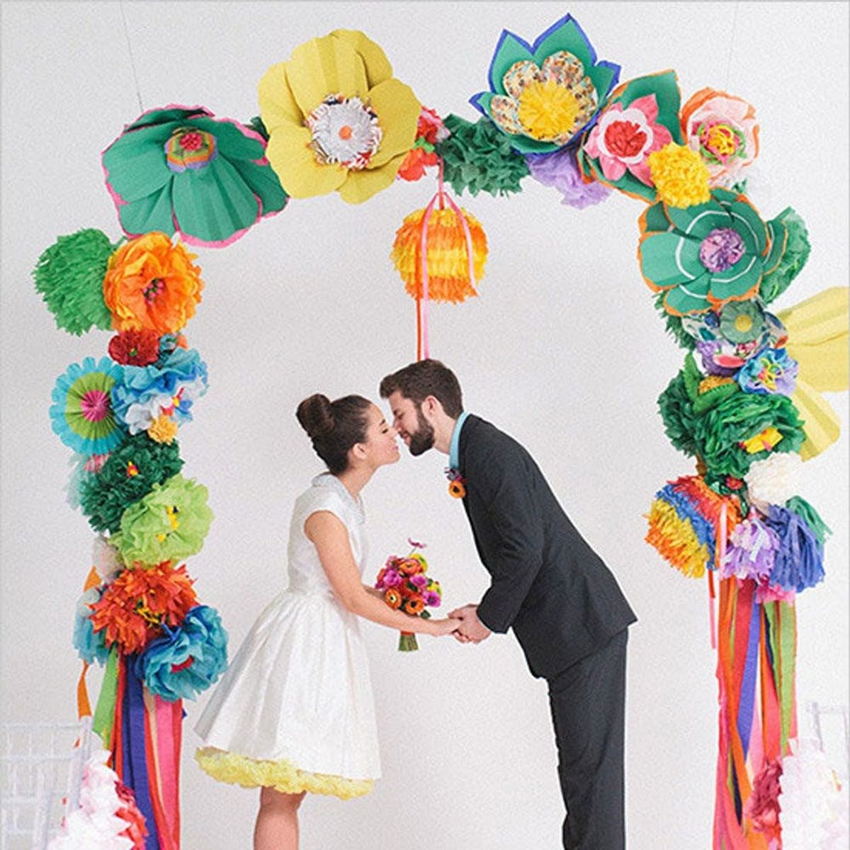 13. Paper Flower Arch: Paper flowers in big bold colors make for super memorable wedding pictures. This backdrop definitely sets a decidedly fun tone for the rest of the day. (via Hair Today)