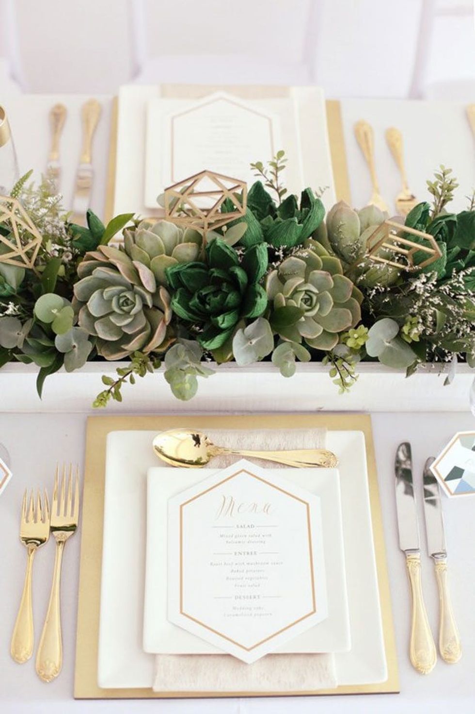 3. Eclectic Place Settings: Take elegant minimalism to the next level by pairing clean lines of white and gold with boho succulents and tiny geo accents. The combination makes for a totally balanced, yet showstopping look. (via Hello Love Photography / The Wedding Community)