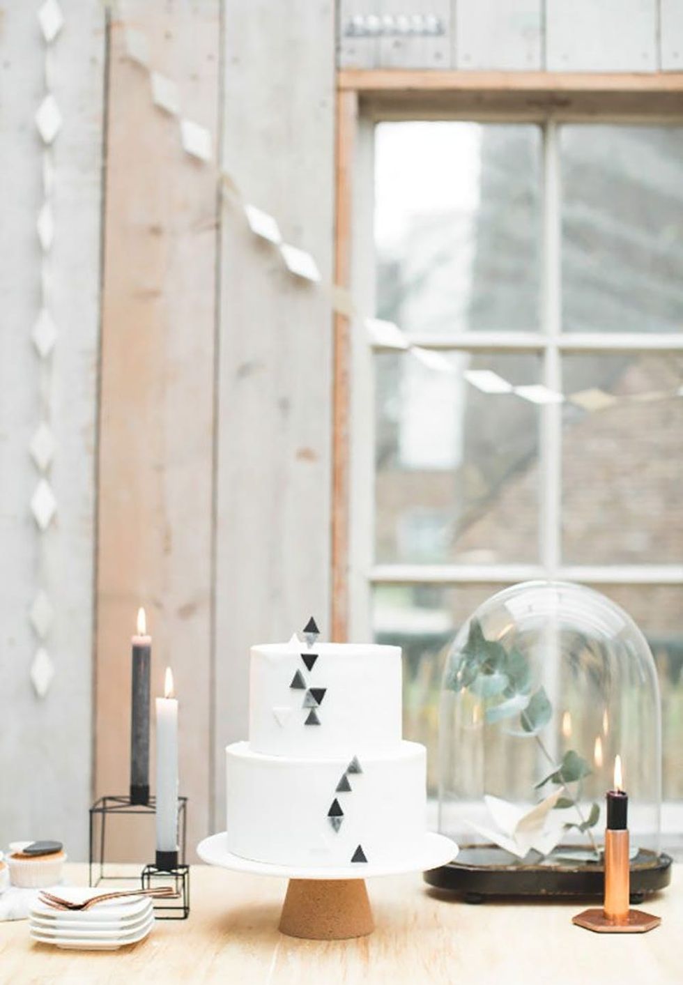 2. Understated Cake: Keeping your cake super basic can be a wonderful thing when geometric shapes and subtle touches of greenery are involved. The top tier here even has us thinking blank cake might be the new drip cake. (via Brandon Scott Photography / Wedding Chicks)