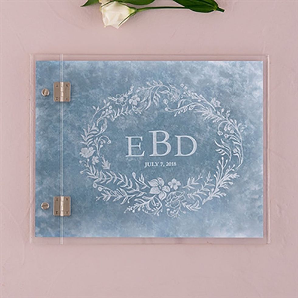 4. The Wedding Shoppe Clear Acrylic Book ($80): Acrylic is super hot these days, and for a wedding book cover it makes for a modern and sleek look. Customize the landing page and you’re in business.