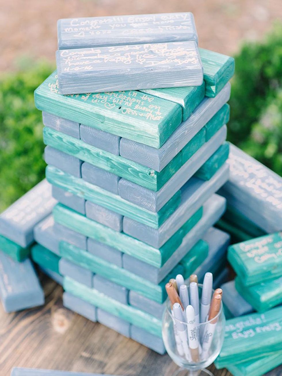 7. Wedding Jenga: For the couple who loves game night, an interactive guest book will make sure that well-wishes and messages of love are never forgotten. (via Aaron and Jillian Photography / The Knot)
