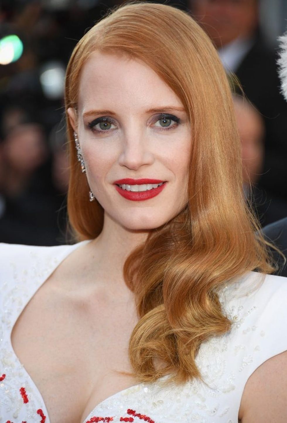 1. Jessica Chastain: Celebrity hairstylist Renato Campora channeled Old Hollywood glam to create Chastain’s nostalgic look. Treating the star’s locks with argan oil-infused haircare products, Campora added polish with Morrocanoil Glimmer Shine ($14). (Photo via Getty/Venturelli/WireImage)