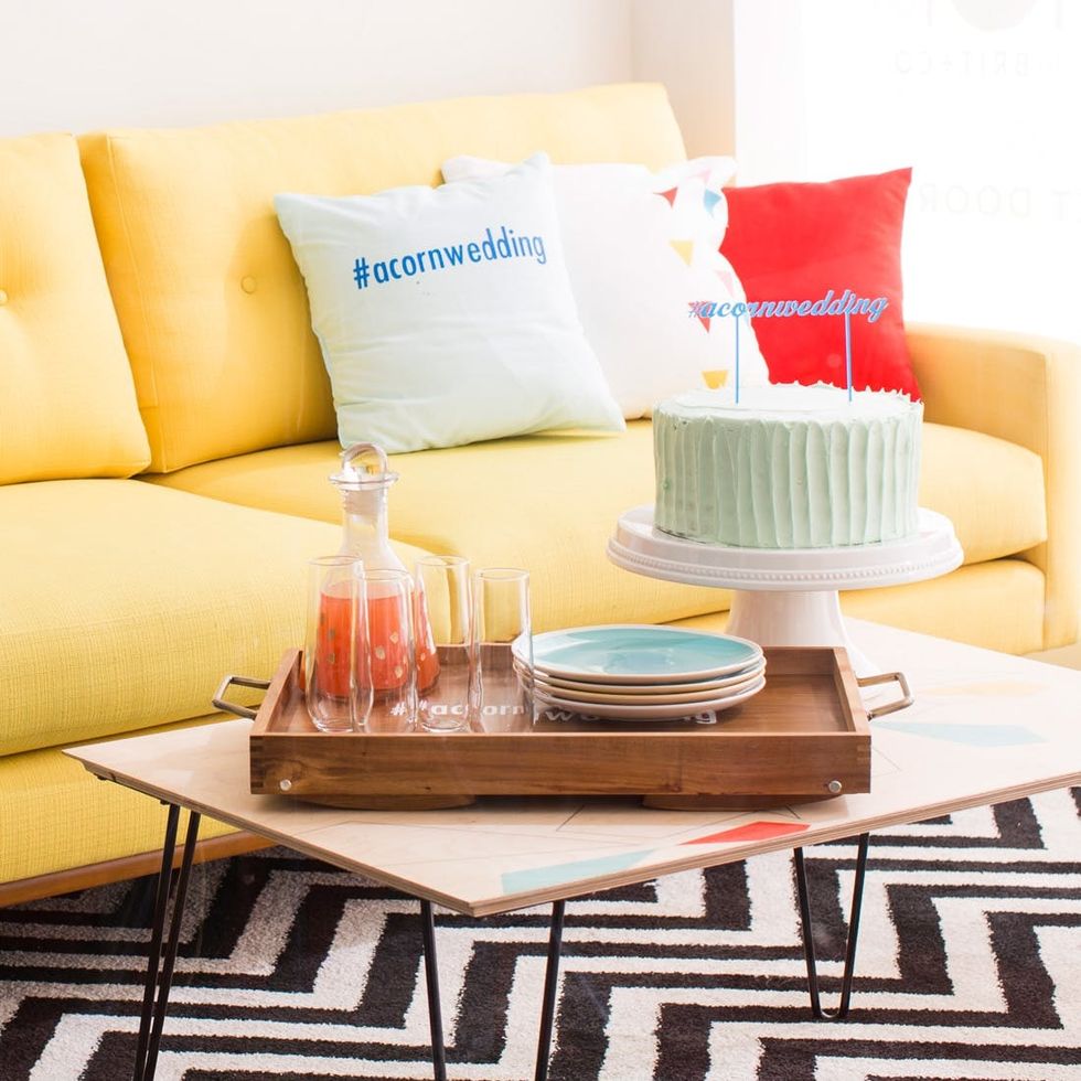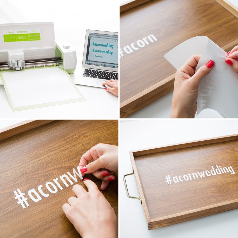 For this project, we used cut out vinyl decals that say #acornwedding. If you don’t have a Cricut, you can do the same thing with an exacto knife. After getting decals prepped, we applied them carefully to a wooden tray.