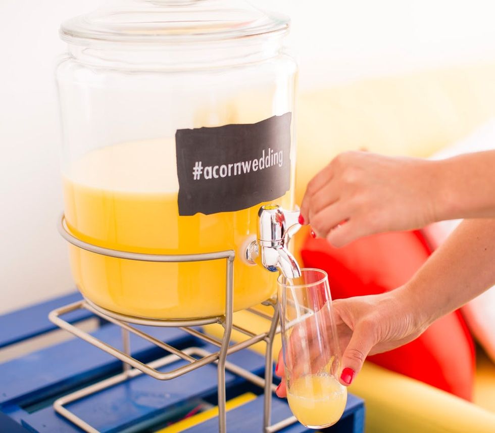 What’s the most popular gathering spot at a wedding? The bar, of course! So it’s a great place to share your hashtag — who really needs to know what’s in that punch anyway? To add this personalization, we created a stencil and then transferred it onto the chalkboard area of this beverage dispenser using a chalkboard pen.