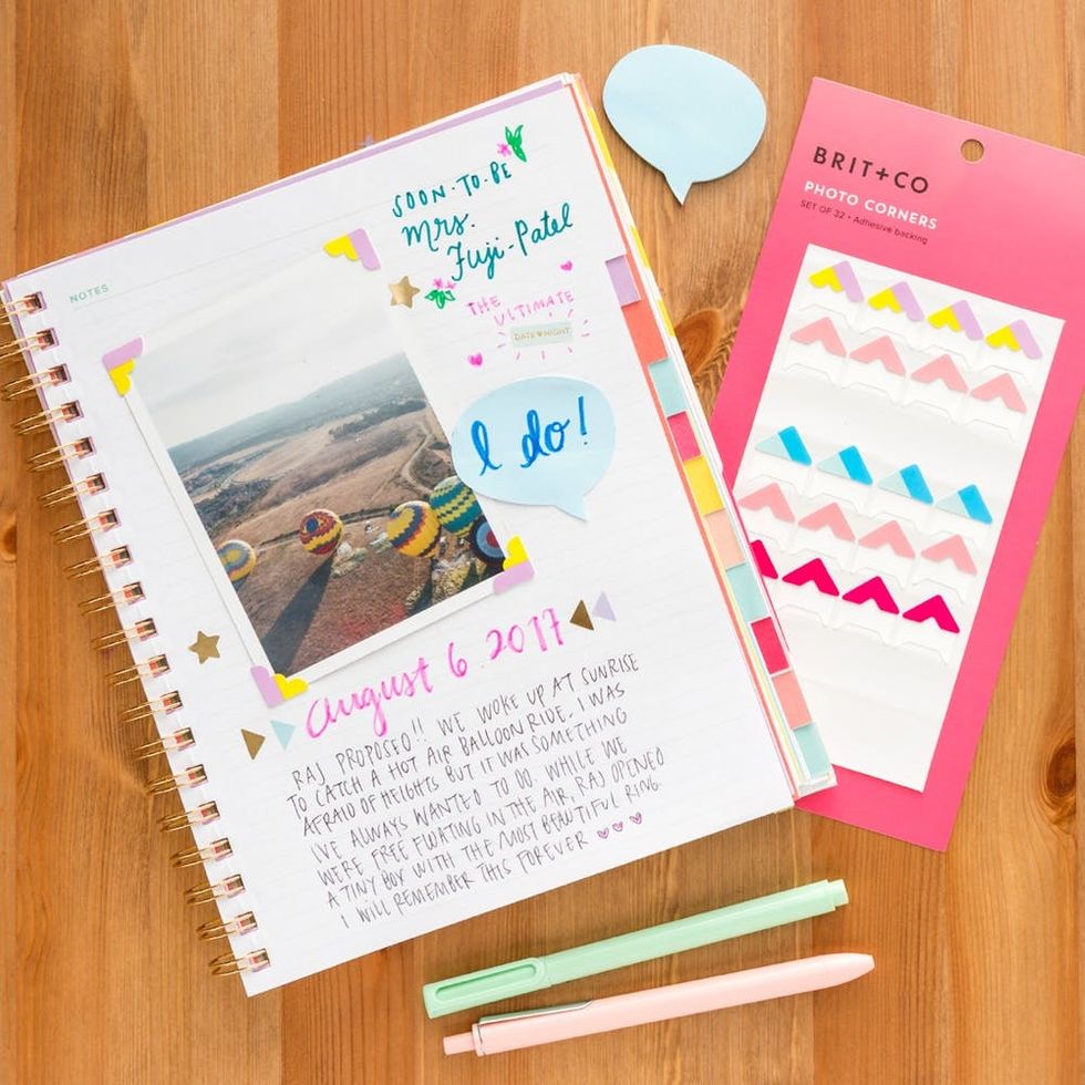 Whether you knew the big ask was coming or not, you’re going to want to remember every moment. Take time to jot down key highlights on what you did, how you felt, and who was there. Add Brit + Co® Photo Corners to your Brit + Co® planner to include some extra mementos and photos to really add to your narrative.