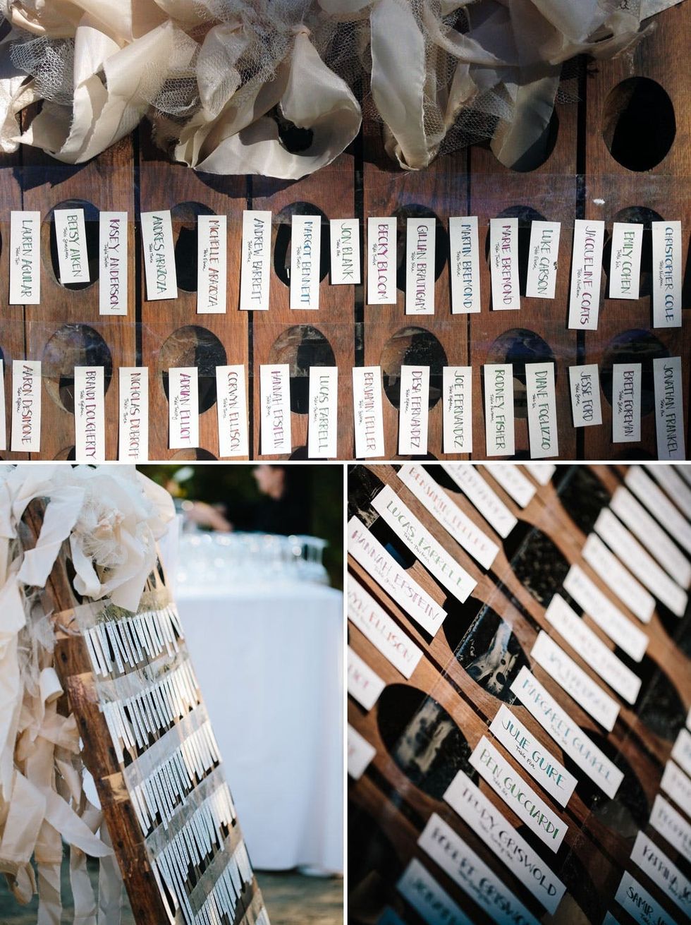 7. Handwritten Escort Cards: For escort cards, we wrote out every name and table number by hand. It was a tedious process but totally worth it. We attached the cards to a vintage wine holder and attached one of our extra garlands to the top. (Yes, we had EXTRA garlands — that’s how on top of it we were!)