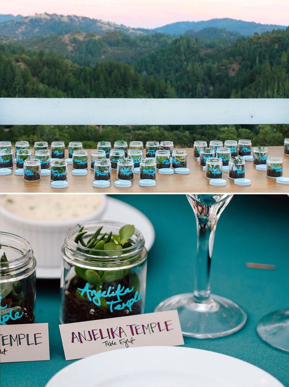 12. Succulent Favors: At every table, each, attendee’s place was marked with a potted succulent. We left a bowl of lids in the middle of the table so folks could close up the jars and take the succulents home. The photo on the top is from the day before the wedding when we wanted to let the succulents soak up as much sun as possible.