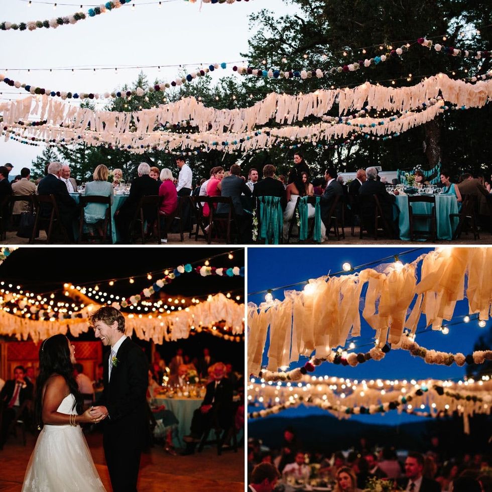 13. Pom Pom Garlands: More pom poms? Yes please! This photo barely does our pom poms justice — we created a dozen garlands each 100 feet long to create this sort of tent-without-a-tent scene.