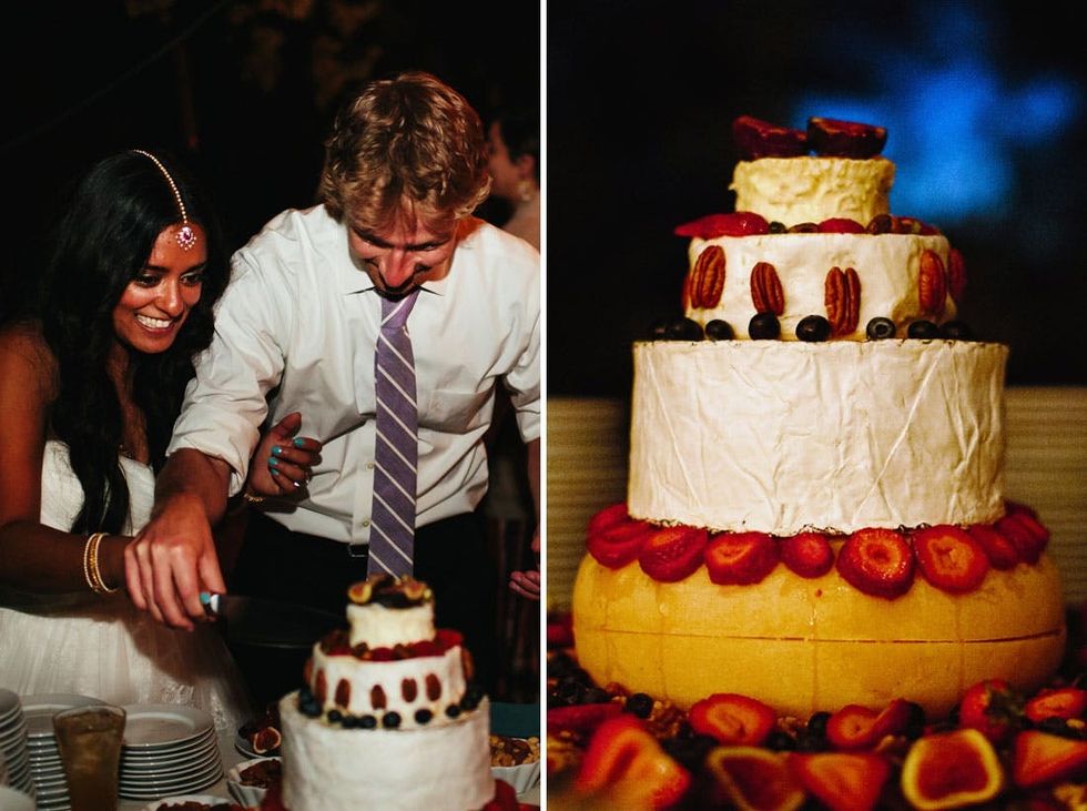 16. “Cheese” Cake: A crowd favorite was our punny take on cheesecake. Instead of going for a sweet dessert, we went for a “cake” made of stacked cheese wheels. We picked out the cheese at Whole Foods and made sure they stacked perfectly, then adorned with nuts and fruit. The question of “who cut the cheese?” was asked way more than once.