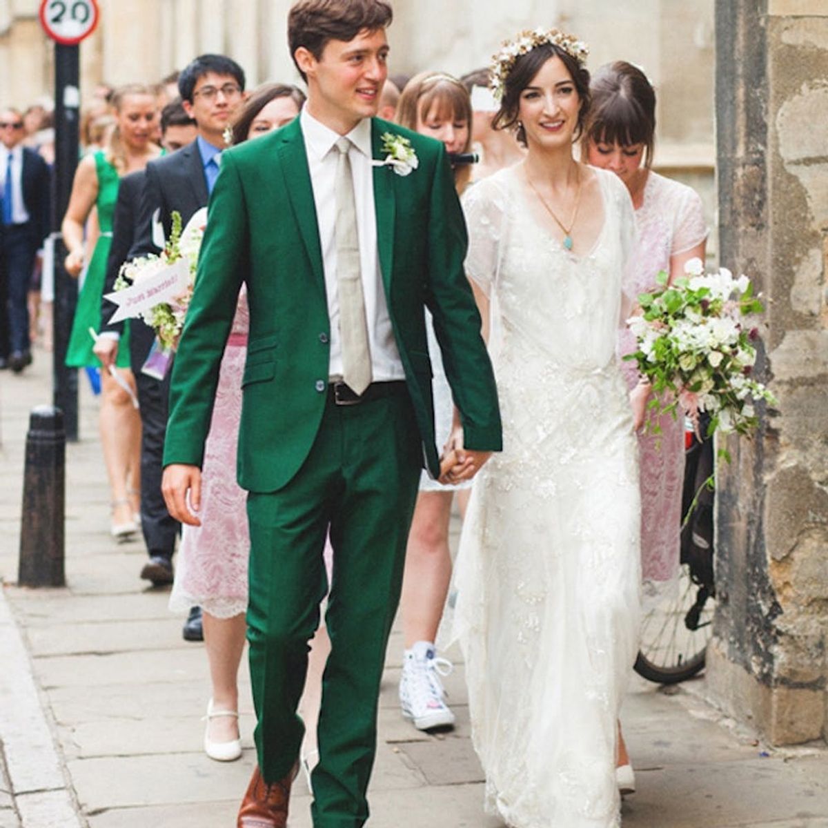 6. 50 Shades of Suits: You will probably wear white, but your groom? He can have a little fun with his suit. In fact, a colorful jacket can make your big day feel fresh and lively, just like you two. (via Love My Dress)