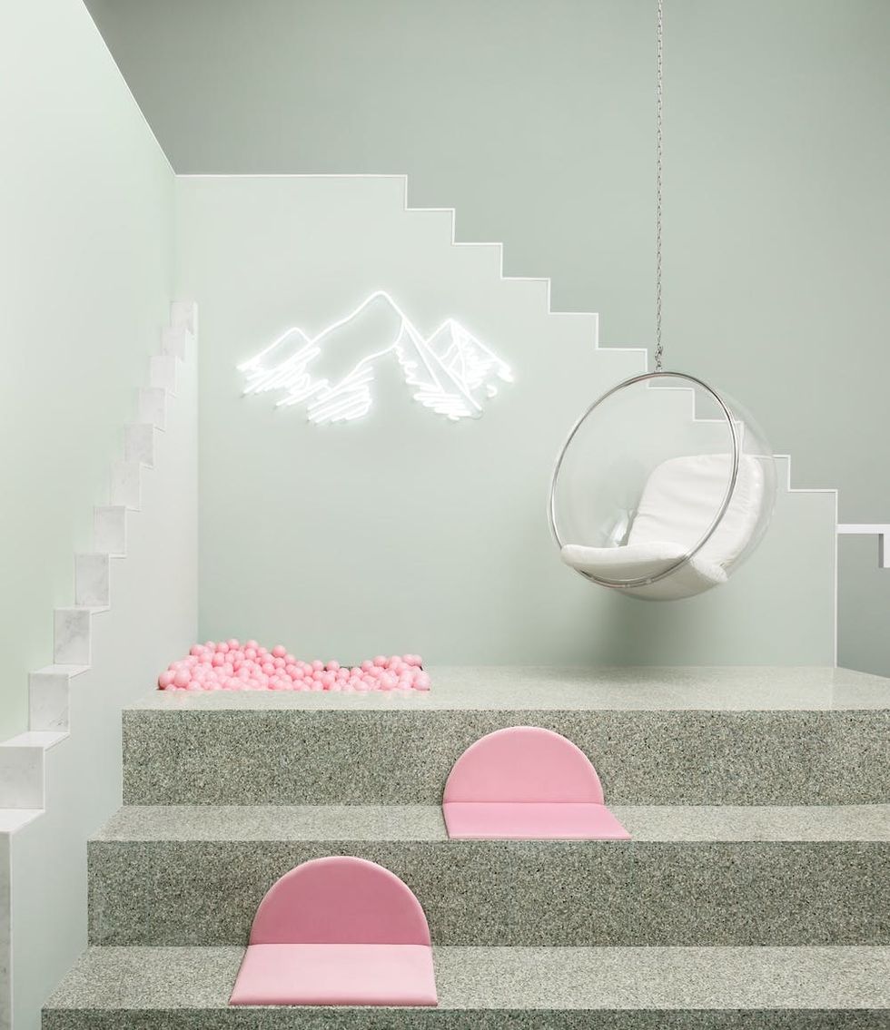 All of the elements were used to make this more than a quick matcha stop. The firm wanted customers to get involved with the indulgent scene they had set. “Layers, elevations, and design features encourage customers to explore and physically engage with the space,” says Biasol. When it comes to integrating with the design, that bubblegum ball pit is totally calling our name.