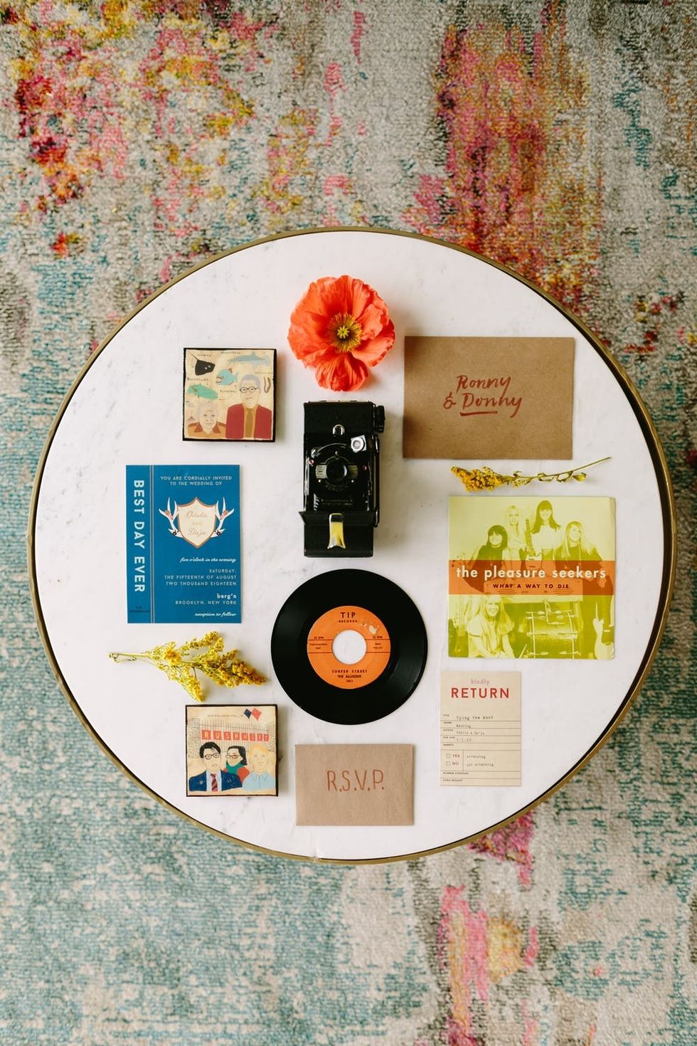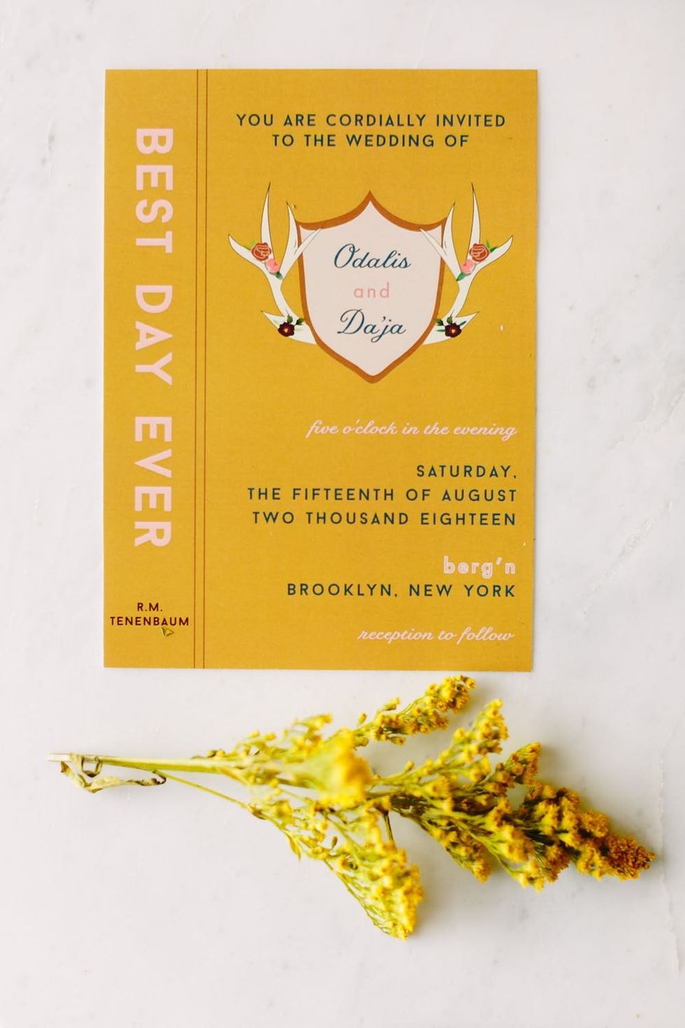 Little nods to Wes Anderson movies abound throughout, like the “book” invitations authored by R.M. Tenenbaum. “I’m really proud of the invitations we sourced from the amazing designer who does WesAnderson paper goods. We worked on the wording together and they looked so good,” says Shackelford.