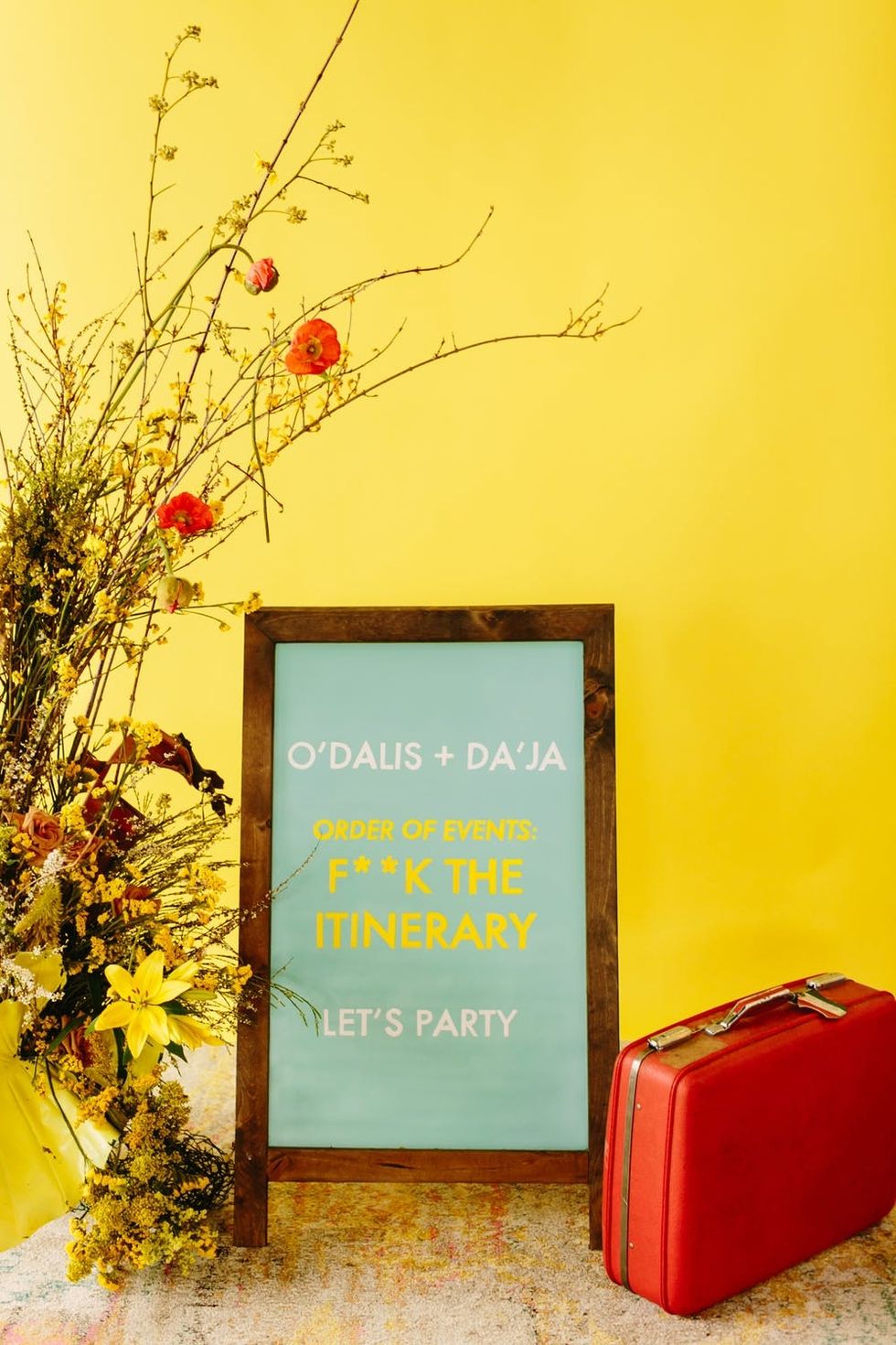 Florals, designed by IndyFaso, stuck to a theme of signature Wes Anderson yellow, while the hand-lettered sign was a clever twist on a classic. “I adore the welcome signage language we landed on: another WesAnderson quote that’s perfect for a total love party,” notes Shackelford.