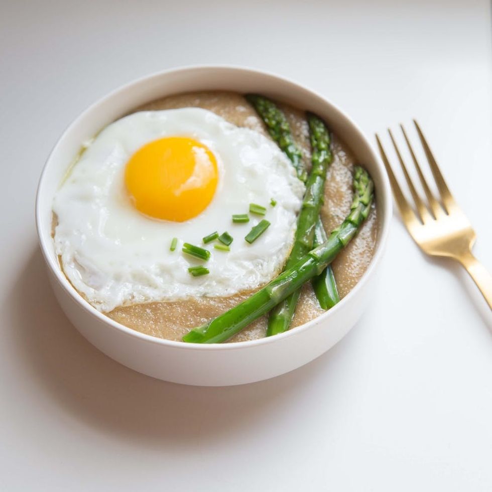 - Stir in the cheese, parsley, and black pepper. Cool for about 5 minutes. Top with fried egg, roasted asparagus spears, and finely chopped chives.