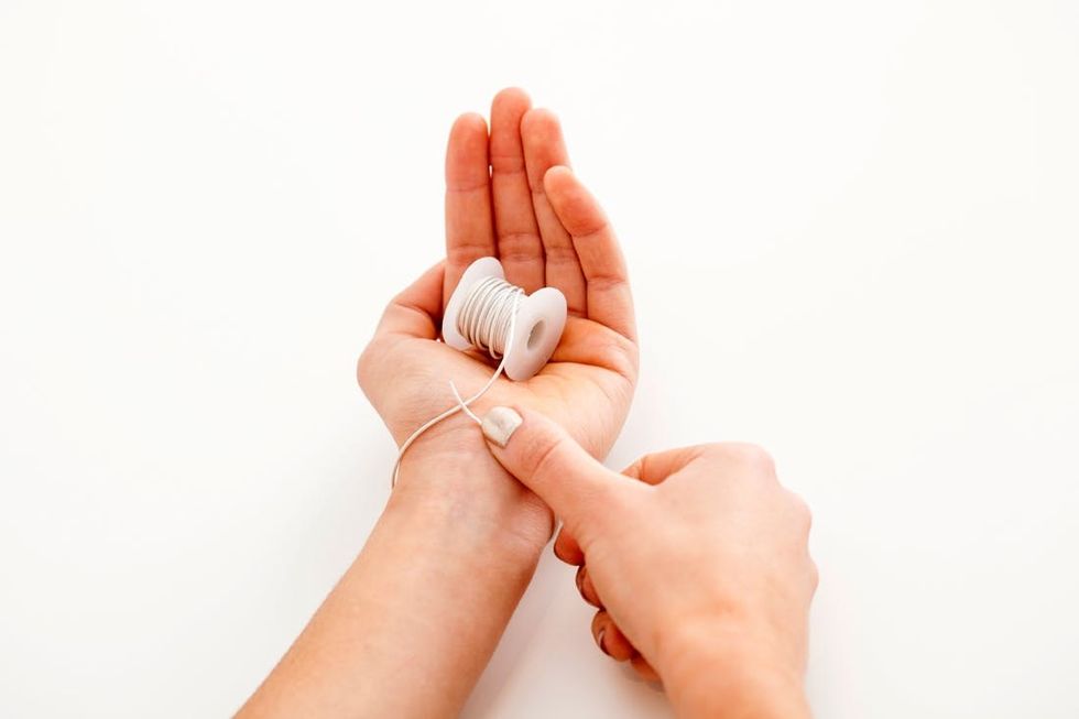 Measure around your wrist and cut a length of cord that just goes all the way around, with a little slack, for a comfortable length.
