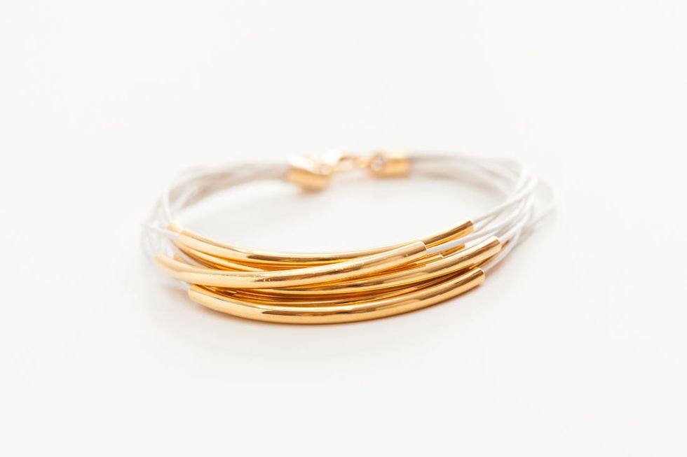 The DIY crew at Brit + Co is happy to announce that a fresh, summery, revamp of one of our favorite Brit Kits is popping up this month! We took our Layered Bracelet Kit and lightened it up with hot white leather, perfect for summer style.
