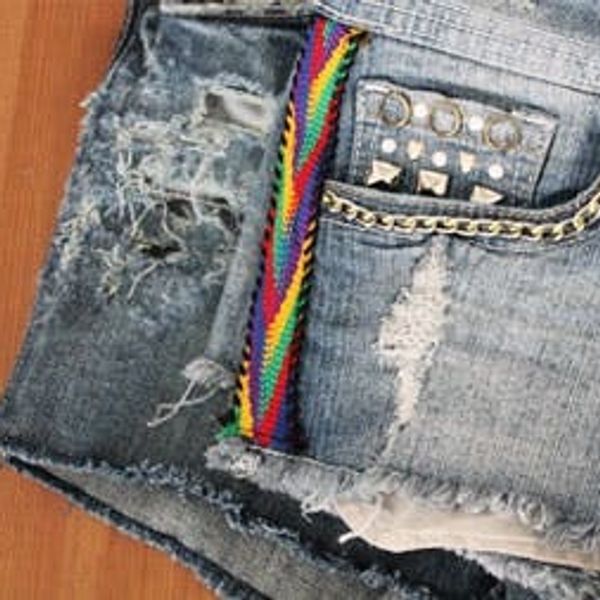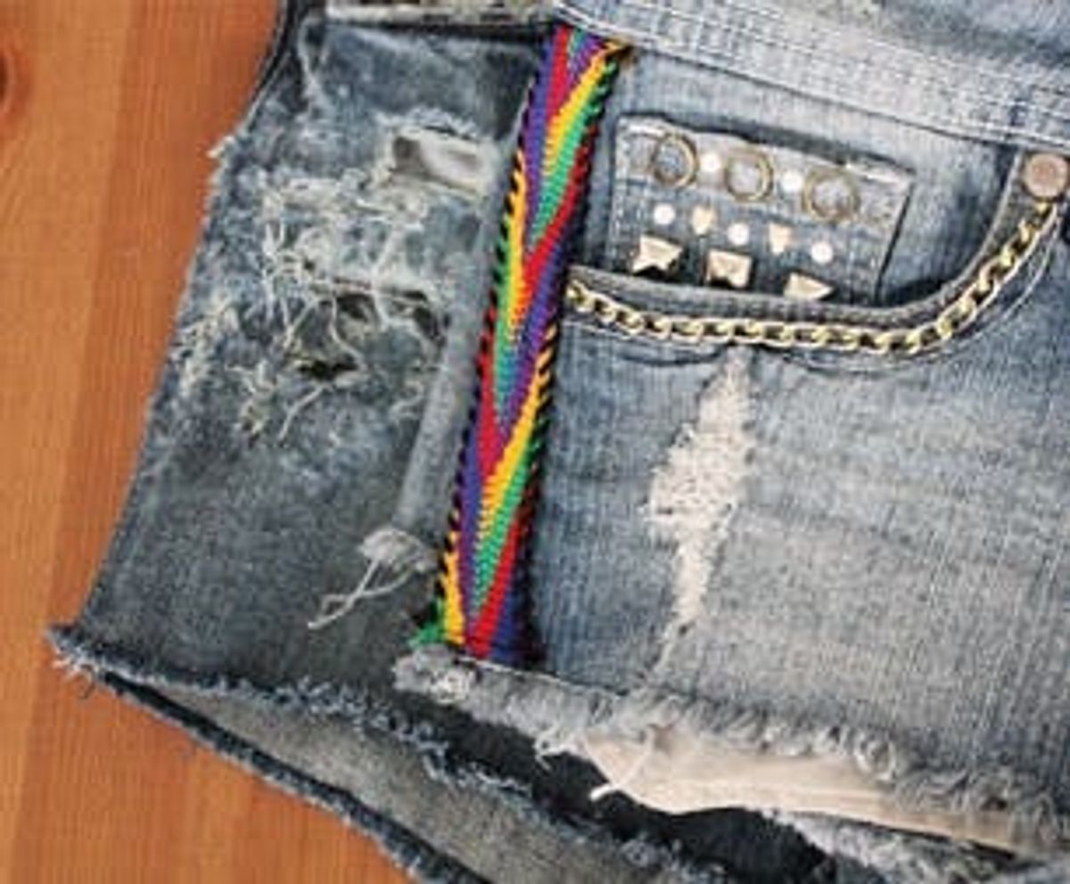And finally, we'll show you some ideas for how to embellish and update an existing pair of cutoffs. We used woven trim, chain, and a few studs we had leftover from last week's flip flop extravaganza.