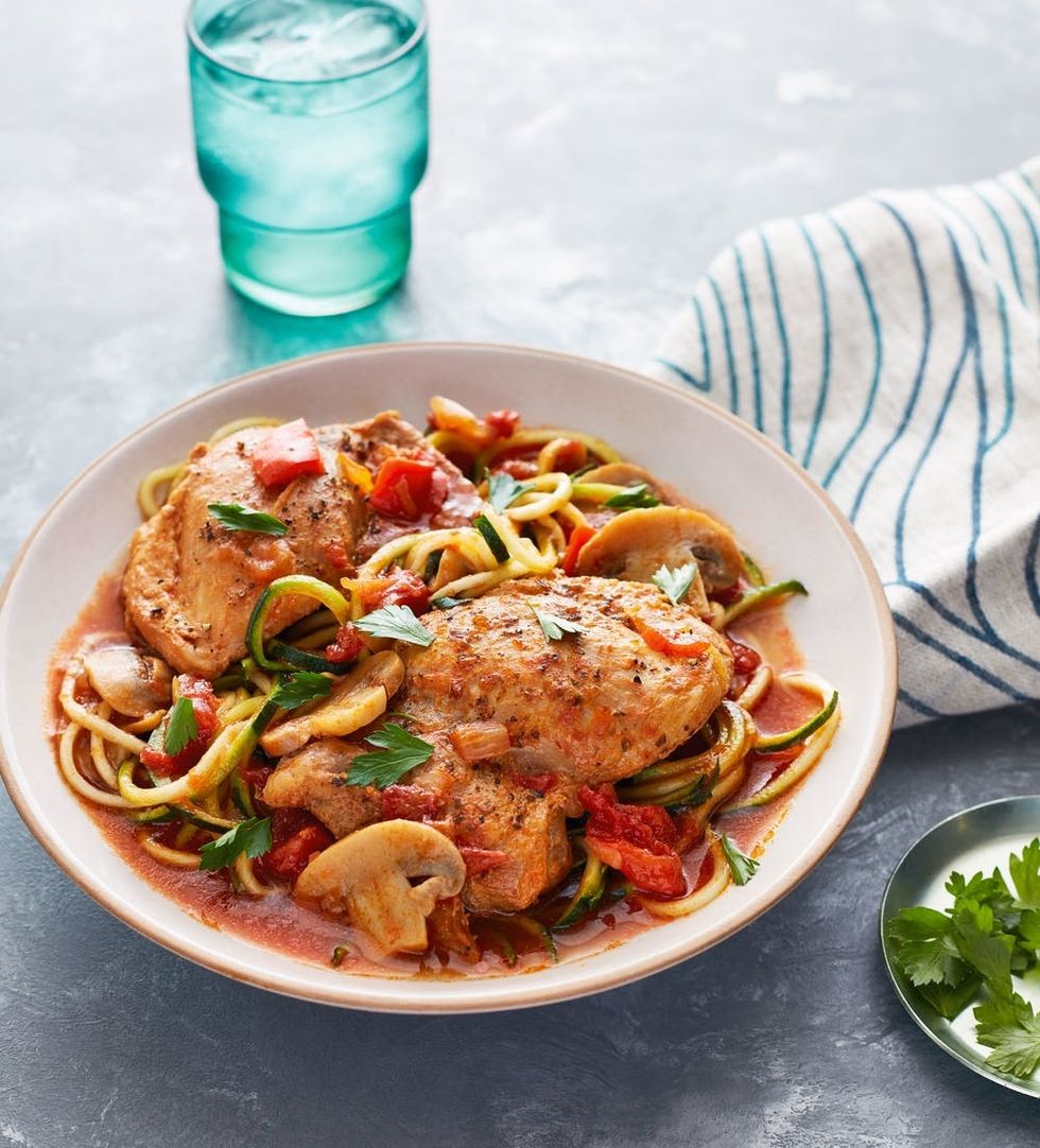 Cacciatore means “hunter" in Italian and refers to a dish cooked with onions, mushrooms, tomatoes, herbs, and sometimes wine. This Whole30 version doesn't contain any wine and subs zucchini noodles for the standard wheat pasta or rice that is usually served with the chicken, but it still has amazingly rich flavor.