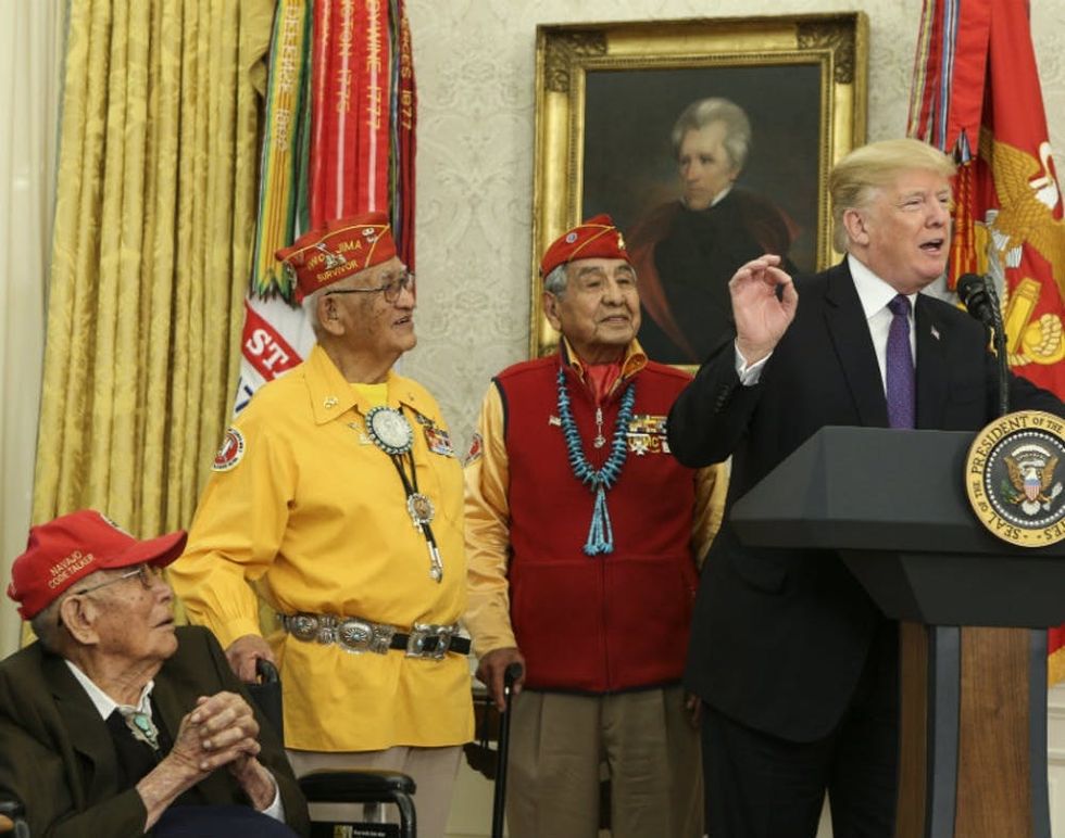 Bilingual Code Talkers played an incredibly important role during the Second World War. Around 500 Indigenous people worked with the US Marines to transmit strategic information, using coded versions of their native languages to keep the messages secret. Three of the 13 surviving Navajo Code Talkers, Thomas Begay, Fleming Begay, and Peter MacDonald, were meant to have been honored by President Trump in the Oval Office yesterday. But instead of a non-partisan speech that paid tribute to the contributions these men made, the President used his platform to aim a confusing yet unmistakably racist comment at Democratic Senator Elizabeth Warren.