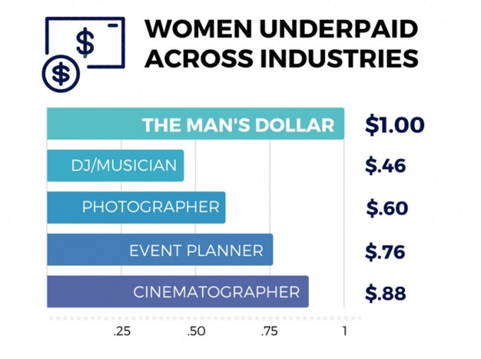 Thinking that there could be a single outlier industry where an extreme gender wage gap was swaying the results, the researchers then broke down the statistics by profession. By far, female DJs and musicians fared worst, earning less than half of their male counterparts’ wages. Photographers earn 60 cents to every male dollar, event planners bring in about 75 percent of men’s income, and cinematographers fared the best, dropping the gap to 12 cents.